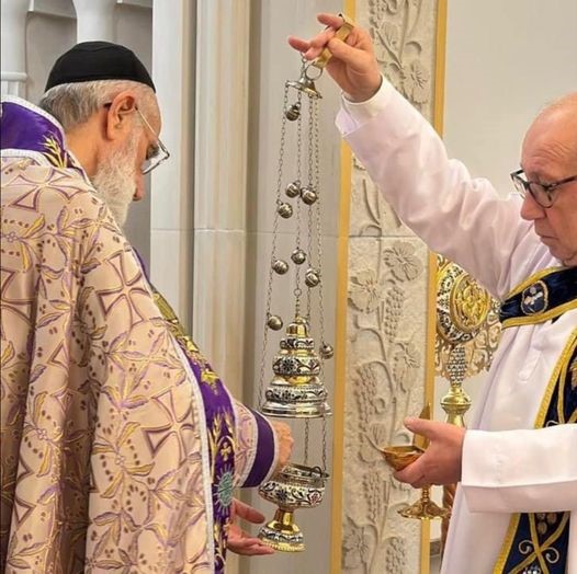 Dann nimmt er die letzte Kette und spricht: „Heilig ist der lebendige Heilige Geist, …“, beräuchert den Altar, das Evangelienbuch und das Volk und fährt dann fort: „… der den Weihrauch Seines sündigen Dieners heiligt und Mitleid hat mit unseren Seelen und den Seelen unserer Vorfahren, unserer Brüder, Schwestern und Lehrer, unserer Verstorbenen und aller im Glauben entschlafenen Kinder der heiligen Kirche in beiden Welten von Ewigkeit zu Ewigkeit. Gemeinde: Amen.