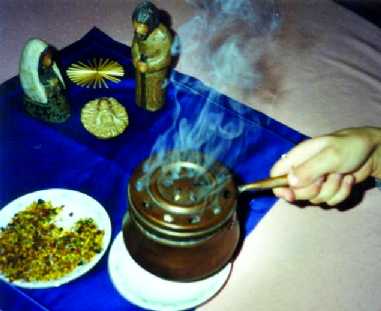 Wenn die Familie versammelt ist, legt ein erwachsenes Familienmitglied die glühende Kohle in ein feuerfestes Gefäß (z.B. Räucherpfanne) und streut einige Körner Weihrauch darauf. Sobald es zu duften beginnt, betet ein Familienmitglied laut vor: